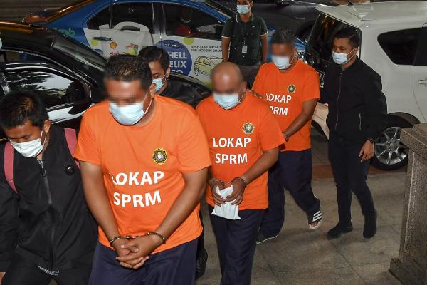 They were detained at the MACC headquarters yesterday after arriving to give their statements, and were brought to the court today at 8.30am, handcuffed and wearing the MACC orange attire.