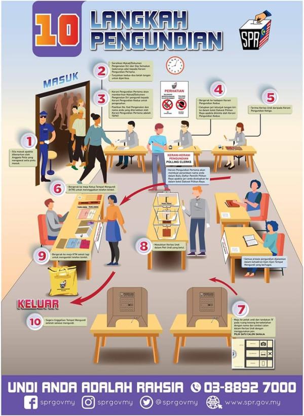 The ‘10 Langkah Pengundian’ (10-Step Voting Guidelines), which outline 10 key steps that must be adhered to by voters when casting their ballots on polling day, are published on the EC's official Facebook page.