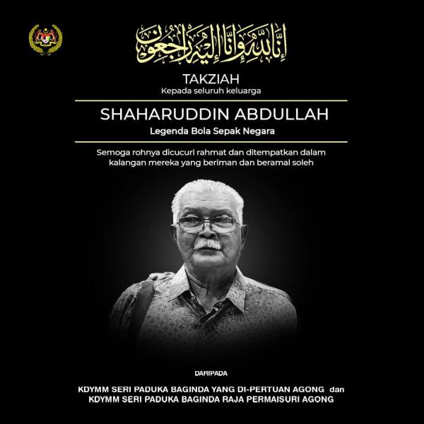 KUALA LUMPUR, Dec 29 — Yang di-Pertuan Agong Al-Sultan Abdullah Ri’ayatuddin Al-Mustafa Billah Shah has extended condolences to the family of national football legend Shaharuddin Abdullah, who died yesterday aged 75.