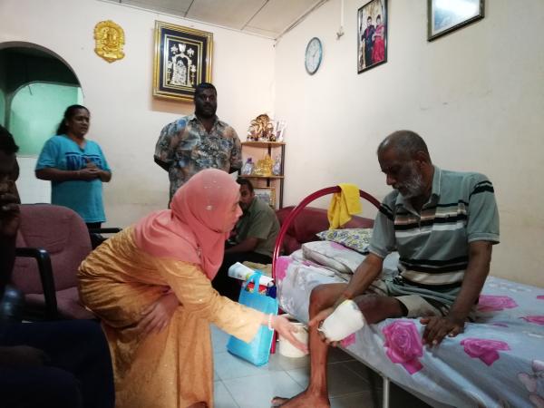 KLANG, 3 MEI: Penyandang kerusi Dewan Undangan Negeri (DUN) N.43 Sementa, Dr Daroyah Alwi menyantuni Maniyam, 65, seorang warga emas penghidap diabetes di Taman Seri Kerayong, di sini, semalam.