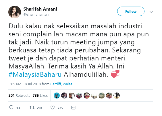Perkembangan positif itu turut diakui pelakon tempatan, Sharifah Amani yang memuji komitmen Kerajaan baharu.
