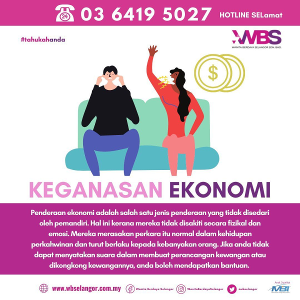 "Contoh keganasan ekonomi adalah aspek kewangan dikawal, disekat sumber kewangan untuk membeli keperluan penting, dipaksa untuk melakukan atau membayar hutang tanpa kerelaan.