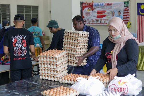 PETALING JAYA, 20 DIS: Sebanyak 500 ekor ayam dan 200 papan telur habis dalam tempoh sejam pada program jualan murah Jelajah Ehsan Rakyat Dewan Undangan Negeri (DUN) Bukit Gasing di Flat Gasing Indah, pagi tadi.