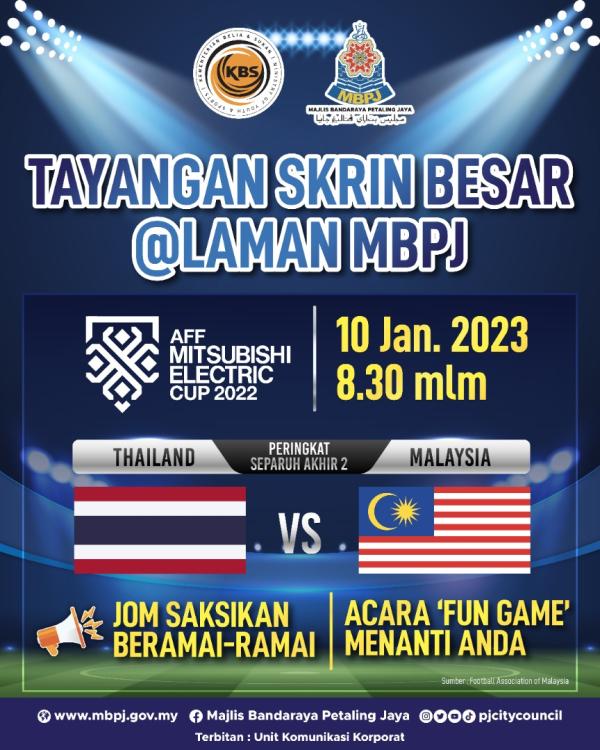 SHAH ALAM, 9 JAN: Majlis Perbandaran Petaling Jaya (MBPJ) menyediakan pelbagai aktiviti menarik pada tayangan skrin besar di Laman MBPJ sempena perlawanan separuh akhir kedua Piala AFF antara Malaysia dan Thailand, esok.