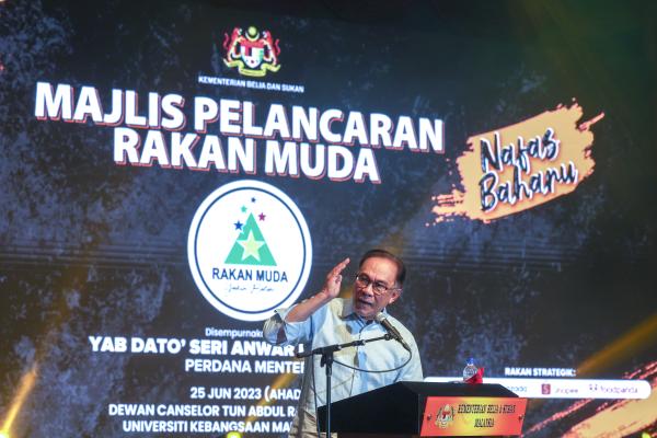 Perdana Menteri Datuk Seri Anwar Ibrahim (dua, kiri) ketika melancarkan Rakan Muda Nafas Baharu di Dewan Canselor Tun Abdul Razak, Universiti Kebangsaan Malaysia (UKM) pada 25 Jun 2023.