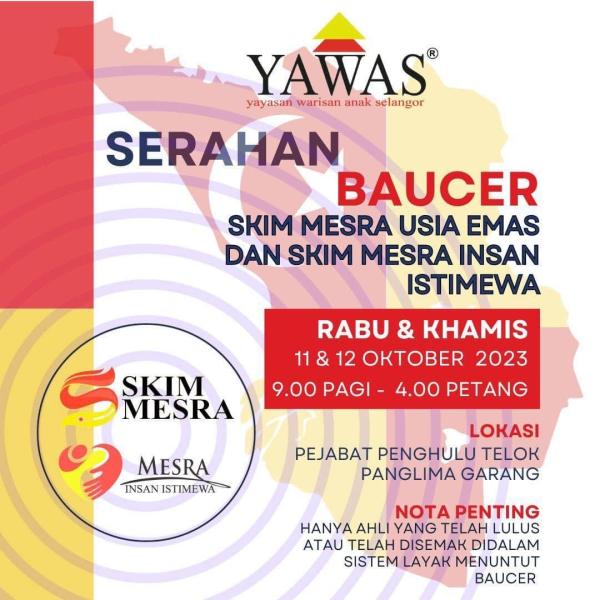 SHAH ALAM, 10 OKT: Yayasan Warisan Anak Selangor (Yawas) membuka kaunter serahan baucar Jom Shopping Skim Mesra Usia Emas (SMUE) dan Insan Istimewa (SMIS) di pejabat penghulu mukim Telok Panglima Garang, esok.