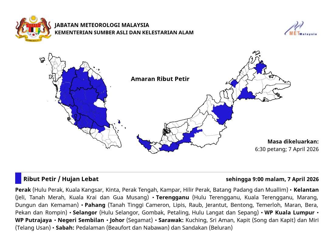 KUALA LUMPUR, 7 APRIL: Ribut petir, hujan lebat dan angin kencang dijangka melanda sembilan negeri serta Kuala Lumpur dan Putrajaya hingga 9 malam ini.