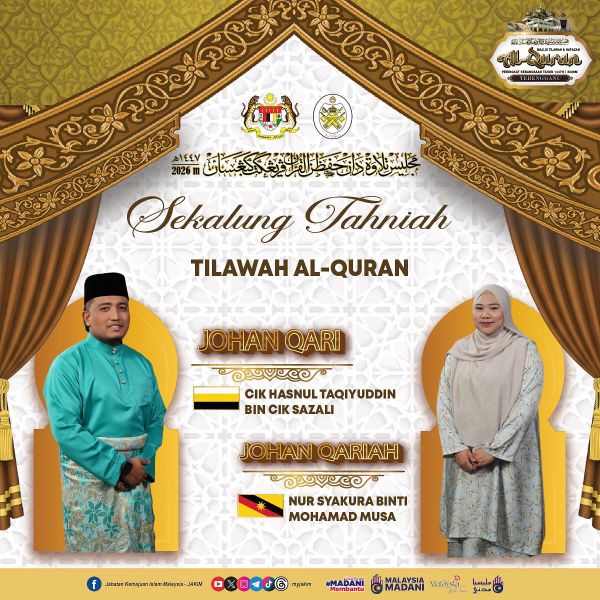 KUALA NERUS, 18 APRIL: Qari dari Perak Cik Hasnul Taqiyuddin Cik Sazali dan qariah Nur Syakura Mohamad Musa yang mewakili Sarawak diumumkan sebagai johan Tilawah Al-Quran dan Hafazan Peringkat Kebangsaan Tahun 1447/2026M.