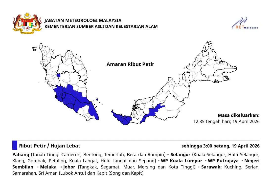 SHAH ALAM, 19 APRIL: Ribut petir, hujan lebat dan angin kencang dijangka melanda beberapa kawasan di Selangor selain Kuala Lumpur, Putrajaya, Negeri Sembilan dan Melaka sehingga 3 petang.