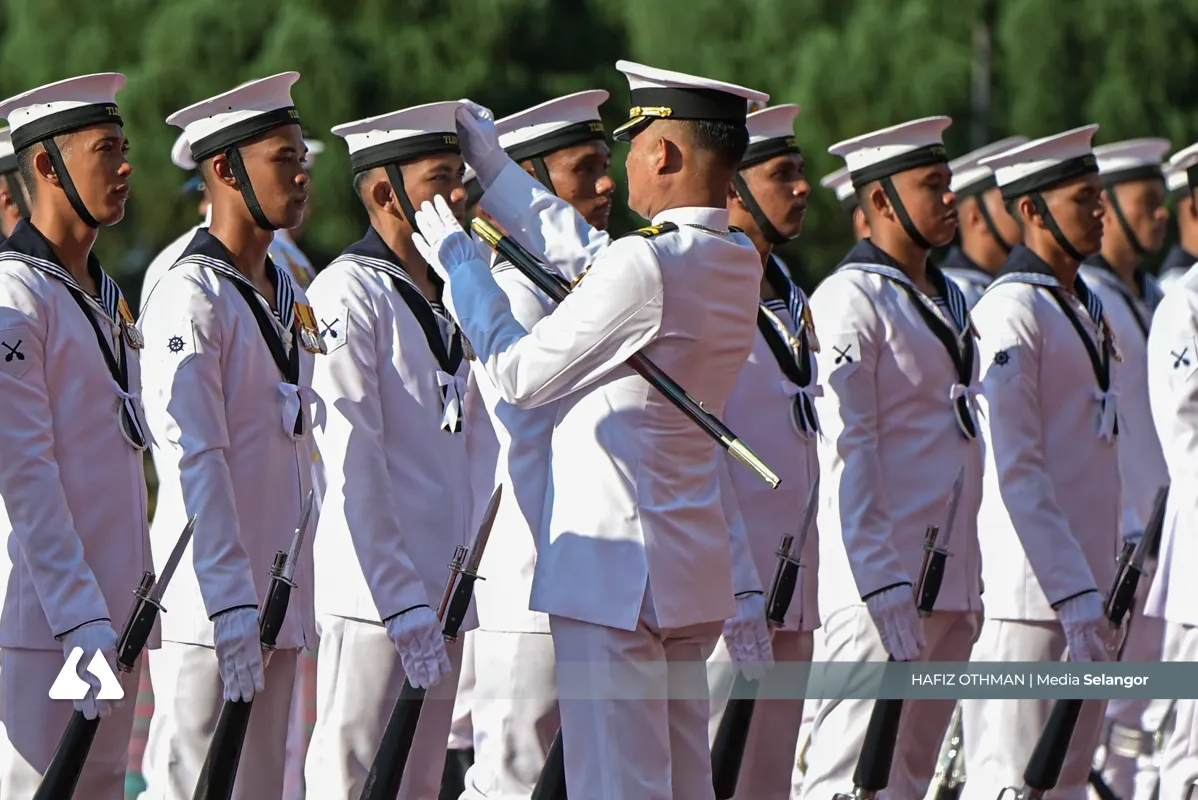 Pegawai Tentera Laut Diraja Malaysia (TLDM) mengemaskan topi anggota sebelum pemeriksaan kawalan kehormat utama ketika Istiadat Pembukaan Mesyuarat Penggal ketiga Dewan Negeri Selangor, Shah Alam pada 20 April 2026.Foto HAFIZ OTHMAN/MEDIA SELANGOR.