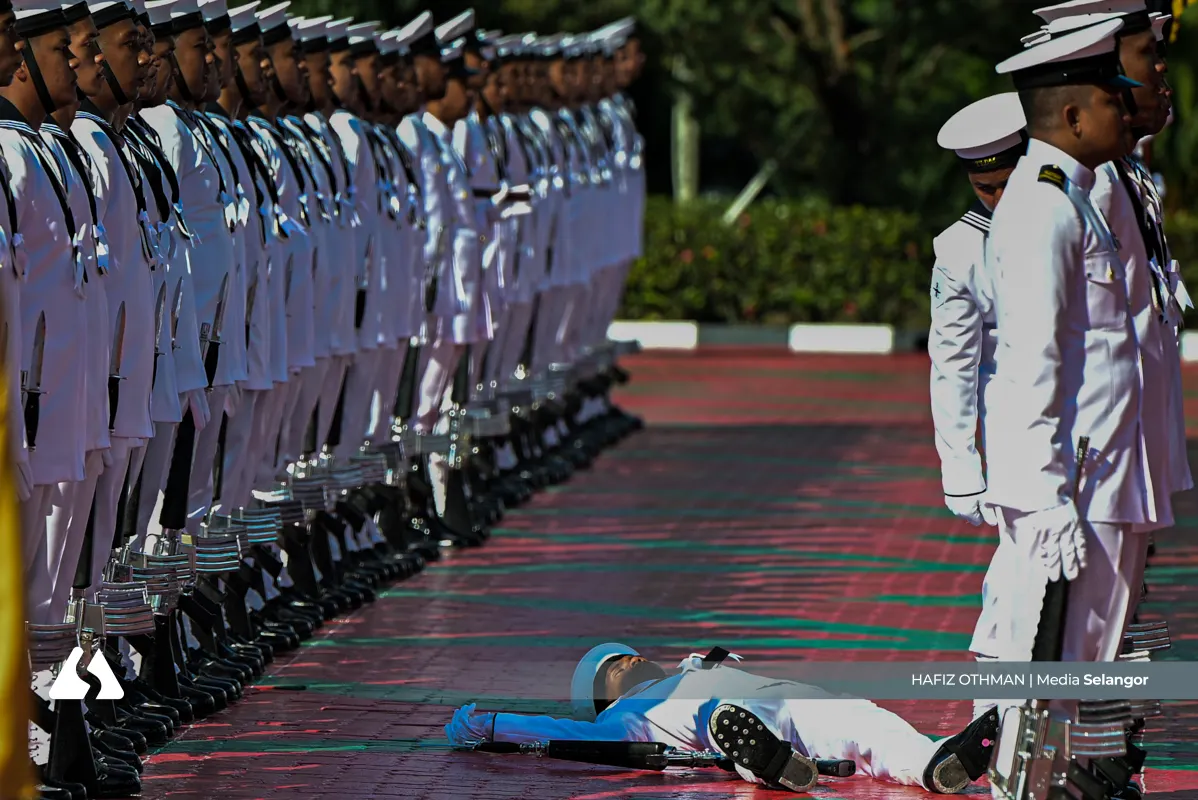 Seorang anggota Tentera Laut Diraja Malaysia (TLDM) jatuh pengsan sebelum pemeriksaan kawalan kehormat utama ketika Istiadat Pembukaan Mesyuarat Penggal ketiga Dewan Negeri Selangor, Shah Alam pada 20 April 2026.Foto HAFIZ OTHMAN/MEDIA SELANGOR.