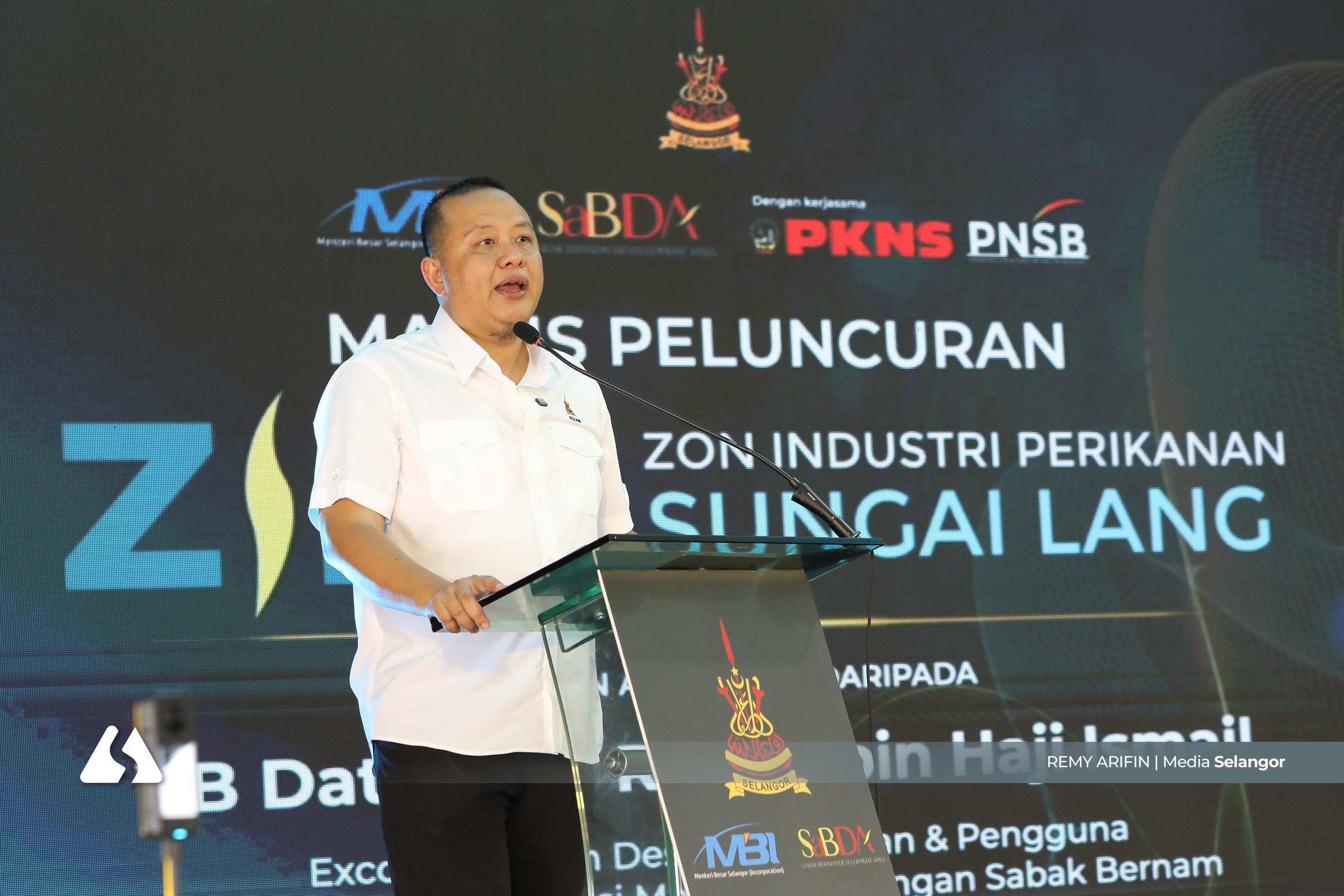 EXCO Kemajuan Desa Datuk Rizam Ismail berucap sempena majlis Peluncuran Zon Industri Perikanan Sungai Lang (ZIPS) di Sungai Lang, Sabak Bernam pada 25 April 2026. Foto REMY ARIFIN/MEDIA SELANGOR