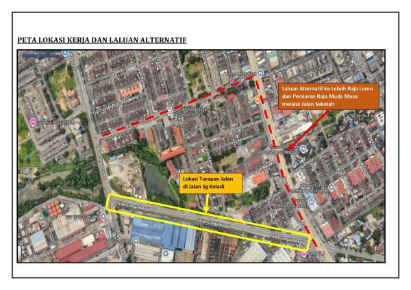 根据市政厅公布的替代路线图,受影响时段的驾驶者可取道拉惹慕达慕沙大路(Persiaran Raja Muda Musa)和学校路(Jalan Sekolah),以避开封闭路段并顺利抵达目的地。