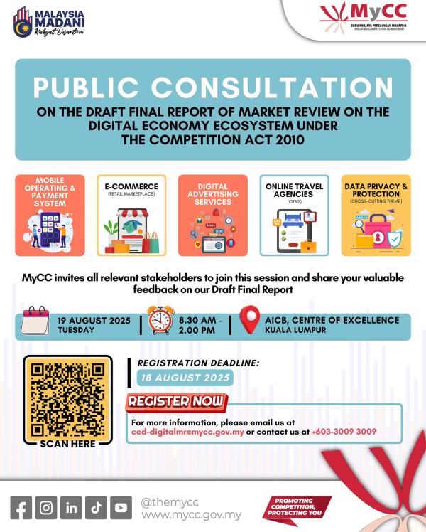更多详情可浏览官网 www.mycc.gov.my ,或电邮ced-digitalmr@mycc.gov.my,或联络竞争经济组(CED)+603-3009 3009。